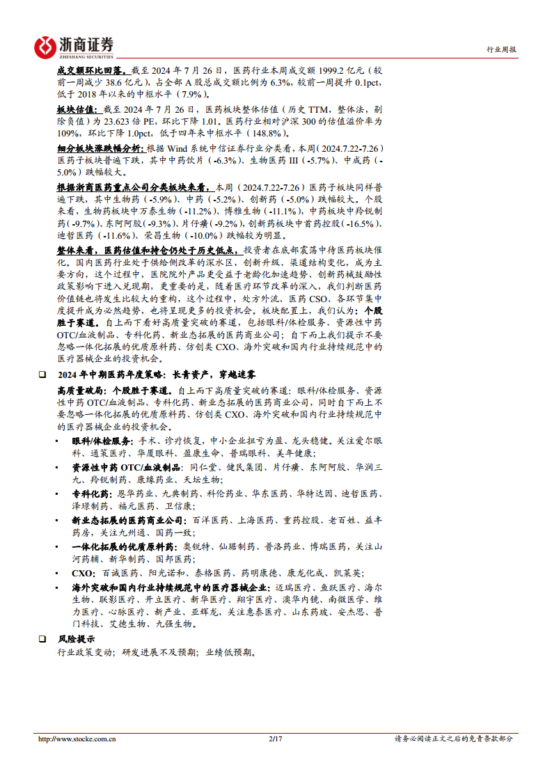 尽管医药板块近期表现低迷,估值和持仓均处于历史低点,但报告认为,在行业供给侧改革的深水区,创新升级和渠道结构变化将带来新的投资机遇。投资策略应聚焦于企业自身的经营能力,强调“个股胜于赛道”,并自上而下看好眼科/体检服务、资源性中药OTC/血液制品、专科化药、新业态医药商业等高质量突破赛道,同时自下而上关注一体化原料药、仿创类CXO、海外突破及规范化医疗器械等细分领域的投资机会。