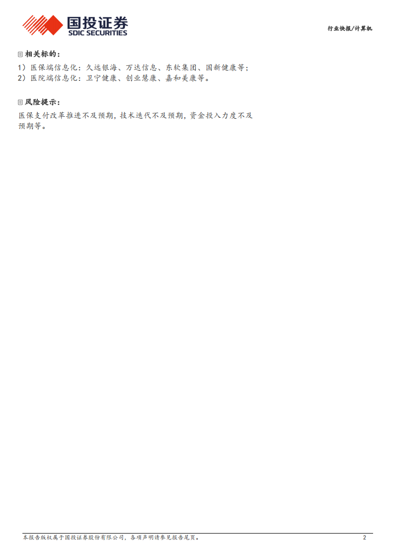 本报告深入分析了国家医保局发布DRG/DIP 2.0版分组方案对医保支付改革的深远影响。报告指出,2.0版方案的推出旨在通过大数据分析提升医保基金的精细化管理水平,并促进医疗机构加强成本管控、实现降本增效。同时,报告强调医保信息化建设正从医保局端向医疗机构端延伸,为相关信息系统供应商带来了广阔的市场机遇。最后,报告列举了医保端和医院端信息化领域的重点标的,并提示了医保支付改革推进、技术迭代和资金投入等潜在风险。