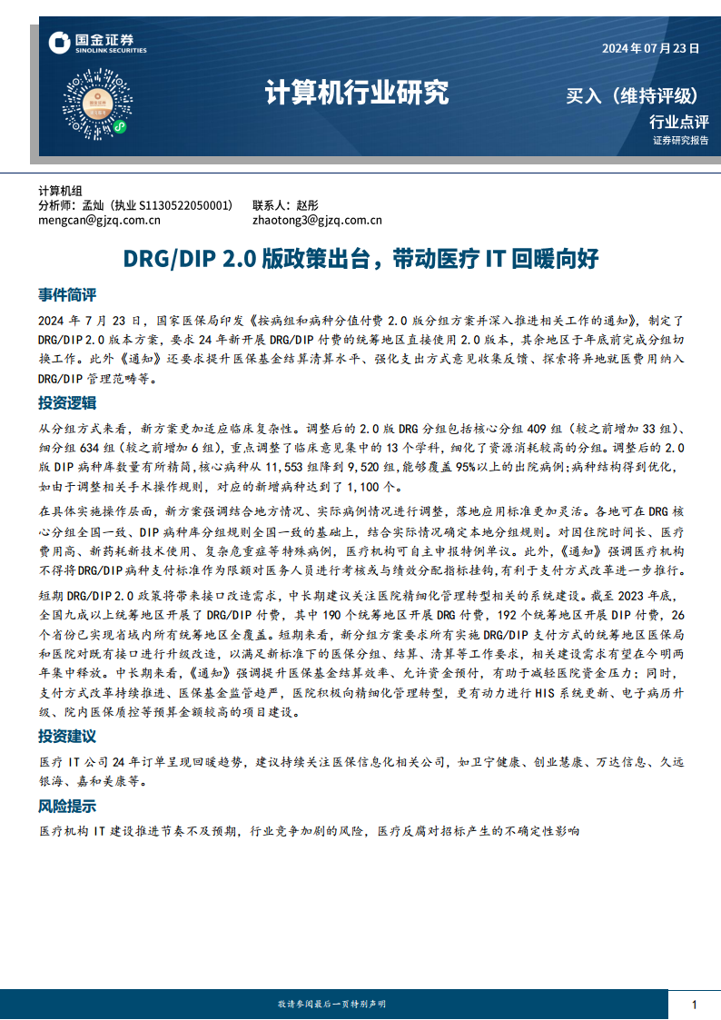 计算机行业点评:DRG DIP 2.0版政策出台,带动医疗IT回暖向好