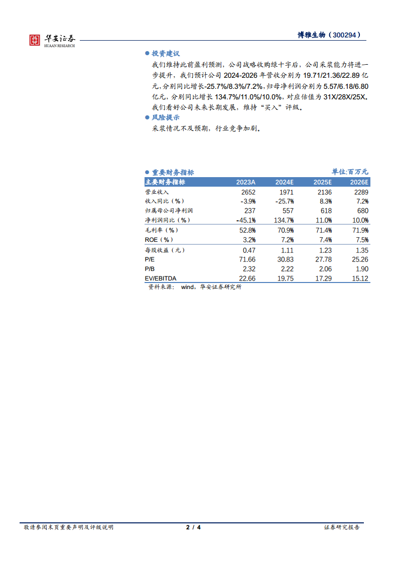 华安证券维持博雅生物“买入”评级,看好公司未来长期发展。根据主要财务指标预测,公司在战略收购绿十字后,采浆能力将进一步提升,从而带动业绩增长。