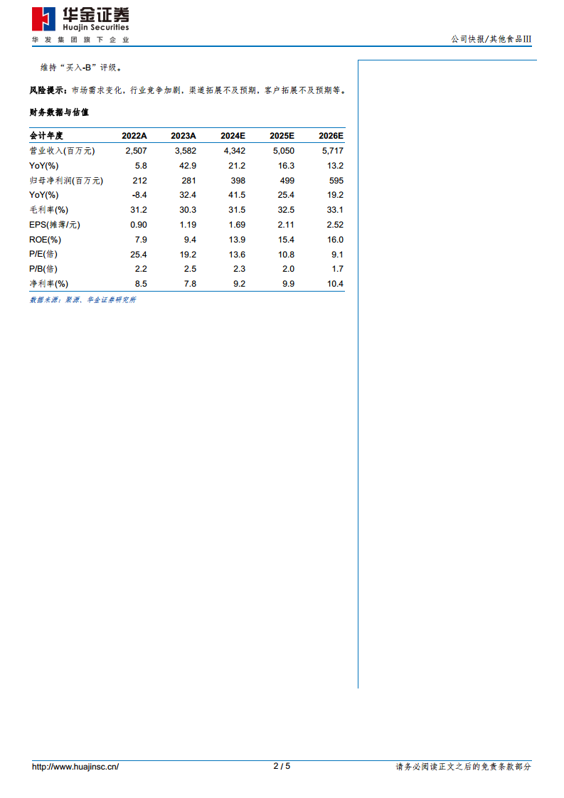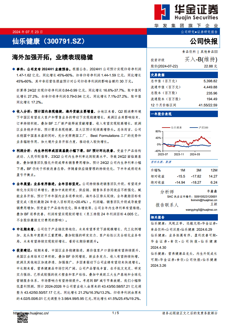华金证券维持对仙乐健康的“买入-B”评级。