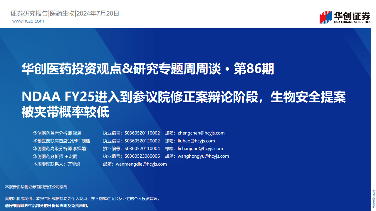华创医药投资观点、研究专题周周谈第86期:NDAA FY25进入到参议院修正案辩论阶段,生物安全提案被夹带概率较低