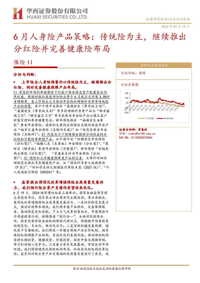 本报告深入分析了当前人身险市场的产品策略调整和监管政策导向。在低利率环境和客户对保本保息需求旺盛的背景下,上市险企正积极通过以传统险为主、辅以分红险和万能险以应对利差压力,并加大健康险布局的多元化策略来适应市场变化。同时,国家金融监督管理总局提出的深化改革措施,特别是对资产负债联动的强化,旨在推动保险业实现高质量发展,有效防范利差损风险,并优化行业经营环境。综合来看,这些积极的产品策略调整和监管政策支持,预计将有效缓解险企的经营压力,促进行业健康发展。鉴于此,本报告维持对保险行业的“增持”评级。