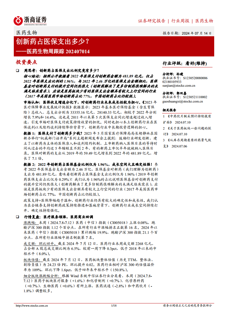 医药生物周跟踪:创新药占医保支出多少?