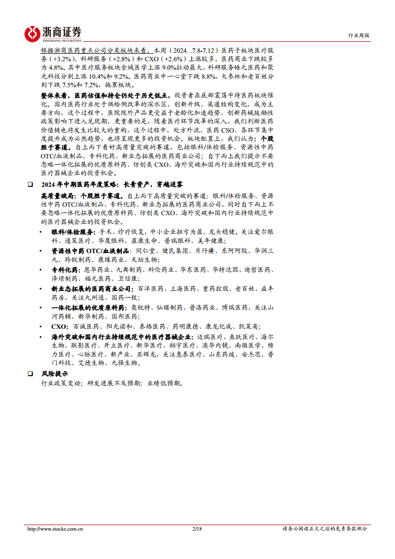本周(2024.7.8-7.12)医药(中信)指数上涨0.08%,跑输沪深300指数1.12个百分点,在所有行业中排名第16。2024年以来,医药指数累计跌幅19.9%,跑输沪深300指数21.1个百分点,排名倒数第7。成交额环比回升至2268亿元,占A股总成交额的6.5%,低于2018年以来的中枢水平(8.0%)。医药板块整体估值(历史TTM)为24.23倍PE,相对沪深300的估值溢价率为109%,低于四年来中枢水平(150.8%)。细分板块中,医疗服务(+1.6%)、化学制剂(+0.7%)、化学原料药(+0.7%)、生物医药(+0.6%)有所上涨,而医药流通(-2.8%)和中药饮片(-1.8%)调整较多。浙商医药重点公司分类显示,医疗服务(+3.2%)、科研服务(+2.8%)和CXO(+2.6%)表现较好,医药商业下跌4.8%。报告认为,医药估值和持仓仍处于历史低点,随着供给侧改革深入,创新升级和渠道结构变化将带来投资机会,尤其看好医院院外产品、创新药械以及处方外流、医药CSO等新业态。