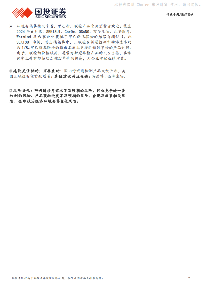 报告强调,美国市场对呼吸道病原体检测的需求旺盛,且本土巨头已呈现出产品联检化、快检化的明显趋势。在此背景下,国产品牌凭借其优秀的产品性能和供应链优势,在亚马逊等线上平台表现强势,尤其在新冠三联检产品领域,有望通过高性价比和产品升级拉动客单价提升,实现业绩增量,为相关企业带来重要的投资机会。