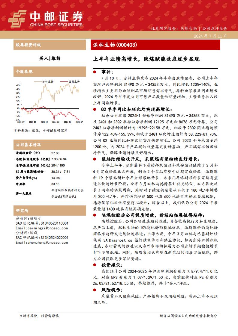 派林生物(000403):上半年业绩高增长,陕煤赋能效应逐步显现