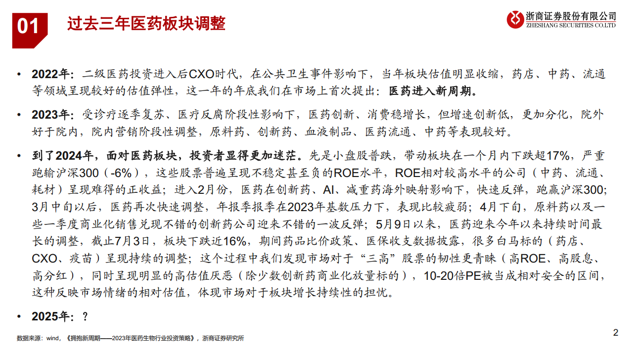 2022年,医药板块在诊疗复苏和医疗反腐影响下,创新和消费领域稳增长但增速创新低,院外表现优于院内。2023年,投资者对医药板块感到迷茫,小盘股普跌导致板块在一个月内下跌超95%,严重跑输沪深300(-6%)。相对较高ROE的公司(中药、流通、耗材)呈现正收益。2024年,医药板块经历快速反弹后再次调整,年报季报表现疲弱。截至7月3日,板块下跌近16%,药品比价政策和医保收支数据披露进一步加剧调整。市场对“三高”股票(高ROE、高股息、高分红)的韧性更青睐,同时呈现明显的高估值厌恶,10-20倍PE被视为相对安全的区间,反映了市场对板块增长持续性的担忧。
