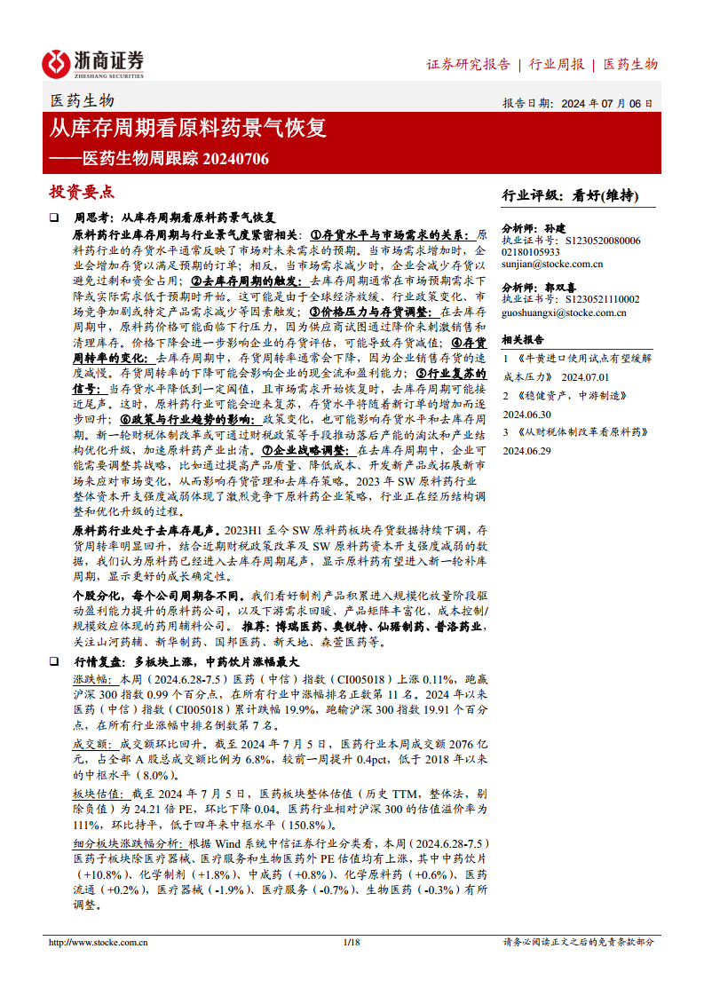 本报告核心观点指出,医药生物行业中的原料药板块正处于去库存周期的尾声,各项数据显示其有望进入新一轮补库周期,预示着更好的成长确定性。通过分析存货水平、存货周转率、财税政策及资本开支强度等关键指标,报告认为原料药行业景气度将逐步恢复。