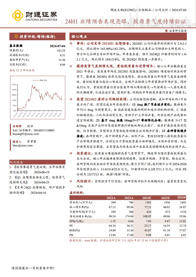 报告维持对锦波生物的“增持”评级。鉴于胶原蛋白赛道持续高景气度,锦波生物作为国内重组胶原蛋白龙头企业,核心单品薇旖美保持高增长趋势,并通过拓展多规格、多型别及联合应用,以及在研管线在细分市场的领先性,展现出广阔的潜力空间。