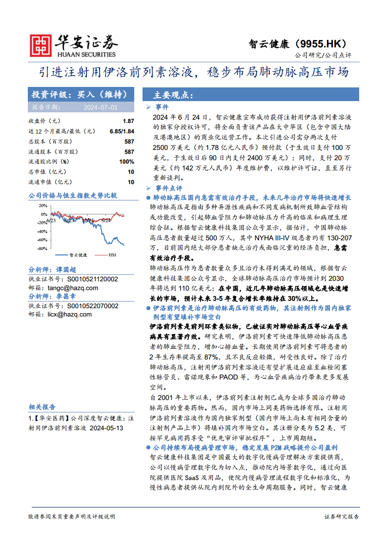 智云健康(09955):引进注射用伊洛前列素溶液,稳步布局肺动脉高压市场