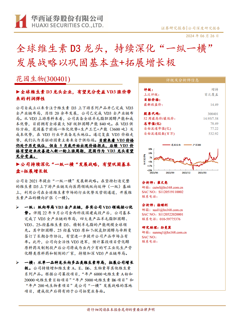 花园生物作为全球维生素D3领域的龙头企业,凭借其在VD3全产业链的深度布局和成本优势,在全球市场中占据领先地位。公司积极实施“一纵一横”发展战略,一方面通过向全活性VD3原料药及制剂延伸,持续巩固VD3领域的核心优势并提升产品附加值;另一方面,通过拓展维生素A、E、B6、生物素等其他维生素品类以及收购花园药业进入医药领域,积极布局高端仿制药研发,以拓宽业务范围和增长极。尽管2023年业绩受市场因素影响有所下滑,但随着VD3价格拐点的出现和公司多元化战略的逐步落地,预计未来几年公司业绩将迎来显著改善。基于对公司核心竞争力和未来增长潜力的分析,报告给予花园生物“增持”评级。