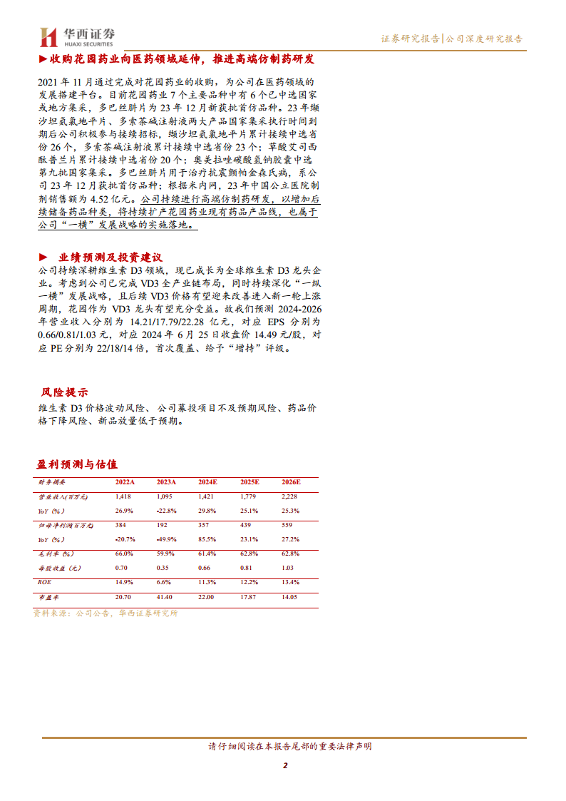- 风险提示: 维生素D3价格波动风险、公司募投项目不及预期风险、药品价格下降风险、新品放量低于预期风险。
