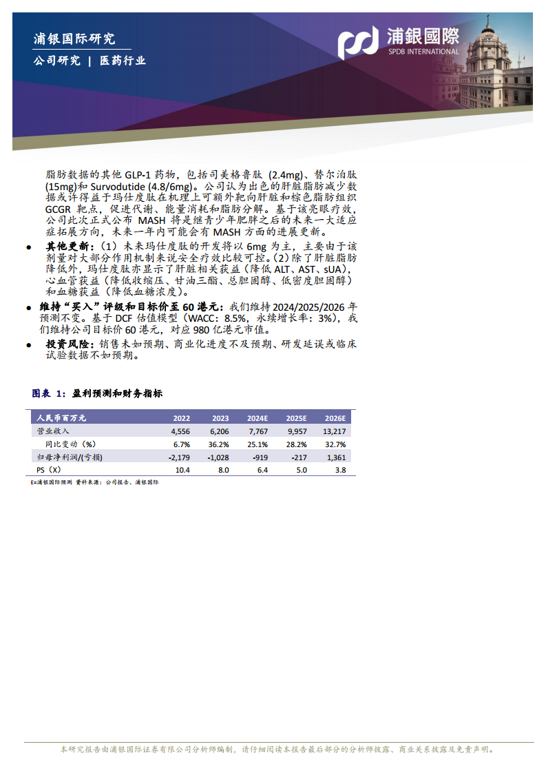 除了减重,玛仕度肽在GLORY-1试验中展现出亮眼的肝脏脂肪降低数据,显著高于安慰剂组,并优于其他已披露数据的GLP-1药物。公司已正式将MASH(代谢功能障碍相关脂肪性肝炎)列为继青少年肥胖之后的未来一大适应症拓展方向,预计未来一年内将有相关进展更新。鉴于玛仕度肽独特的GCGR靶点机制,其在肝脏代谢方面的多重获益(如降低ALT、AST、sUA、改善心血管和血糖指标)进一步巩固了其市场潜力。浦银国际持续看好信达生物在国内减重领域的领先地位和先发优势,重申“买入”评级,目标价维持60港元。