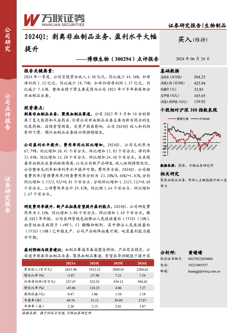 博雅生物在2024年第一季度通过剥离非血制品业务,实现了业务结构的战略性优化,尽管短期内收入和归母净利润有所下降,但盈利能力显著提升,毛利率和净利率均大幅增长。公司持续加大研发投入,在研产品管线丰富,特别是静注人免疫球蛋白(IVIG)(10%)已申报生产,预示着未来产品矩阵的拓展和吨浆盈利能力的提升。在血制品行业高壁垒和稳定需求的背景下,结合华润的赋能,公司未来业绩增长潜力巨大。分析师维持“买入”评级,并对公司未来三年的盈利前景持乐观态度,但投资者仍需关注原材料供应、采浆成本和研发进展等风险因素。