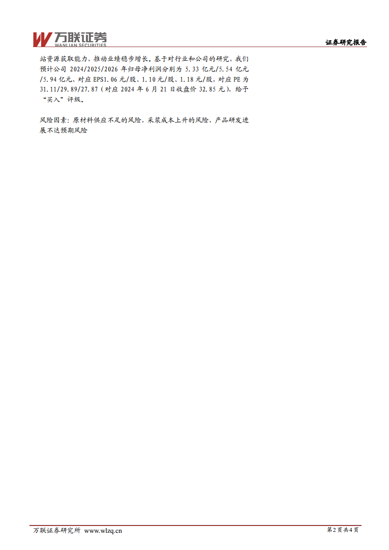 分析师认为,血制品赛道具有高壁垒和产品需求稳定的特性。博雅生物通过逐步剥离非血制品业务,聚焦血制品主业,并有望在华润的赋能下提升浆站资源获取能力,从而推动业绩稳步增长。 基于此,分析师对公司未来业绩进行了预测:预计2024年、2025年和2026年归母净利润分别为5.33亿元、5.54亿元和5.94亿元,同比增长率分别为124.25%、4.06%和7.27%。对应的每股收益(EPS)分别为1.06元/股、1.10元/股和1.18元/股。根据2024年6月21日收盘价32.85元计算,对应的市盈率(PE)分别为31.11倍、29.89倍和27.87倍。 鉴于公司的战略转型和增长潜力,分析师给予博雅生物“买入”评级。同时,报告提示了原材料供应不足、采浆成本上升以及产品研发进展不达预期等潜在风险。