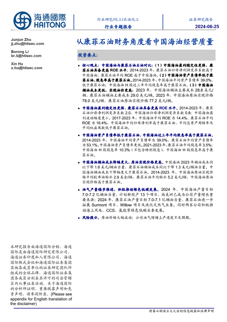 本报告深入对比了中国海油与康菲石油两大油气巨头的经营质量,核心观点指出中国海油在盈利稳定性、资产负债结构、成本控制及股息回报方面展现出显著优势,而康菲石油则在平均ROE水平上略胜一筹。报告通过详尽的数据分析,揭示了两家公司在油气勘探开发、降本增效以及绿色低碳转型方面的不同策略与成效。