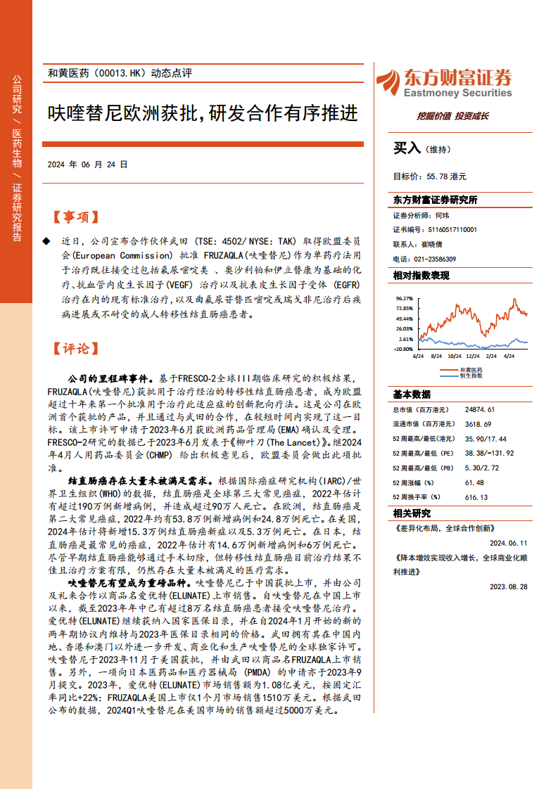 和黄医药(00013):动态点评:呋喹替尼欧洲获批,研发合作有序推进