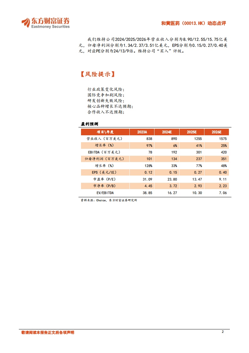 东方财富证券研究所维持和黄医药“买入”评级,目标价55.78港元。预计公司2024/2025/2026年营业收入分别为8.90/12.55/15.75亿美元,同比增长率分别为6%/41%/25%。归母净利润预计分别为1.34/2.37/3.51亿美元,同比增长率分别为33%/77%/48%。对应的每股收益(EPS)分别为0.15/0.27/0.40美元,市盈率(P/E)分别为24/13/9倍。这些积极的财务预测反映了呋喹替尼在全球商业化进程中的强劲增长潜力,以及公司整体盈利能力的持续提升。