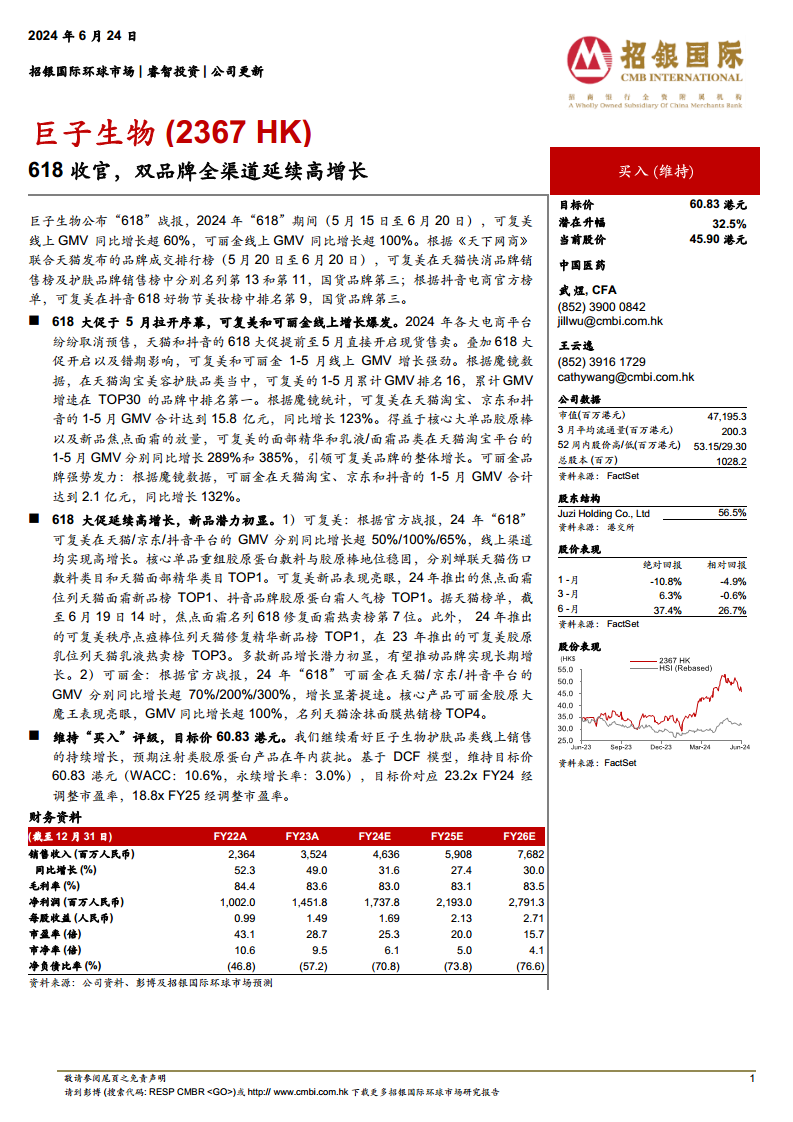 巨子生物在2024年“618”大促期间展现出强劲的增长势头,旗下可复美和可丽金两大品牌线上GMV均实现爆发式增长,远超市场平均水平。这一成功得益于公司在电商渠道的精细化运营、核心大单品的持续热销以及多款创新新品的成功推出。新品如可复美焦点面霜和可丽金胶原大魔王等,不仅在各自细分市场取得领先地位,也为公司未来的业绩增长奠定了坚实基础。招银国际环球市场维持“买入”评级,并重申60.83港元的目标价,反映了对巨子生物护肤品类线上销售持续增长和注射类胶原蛋白产品获批的积极预期。