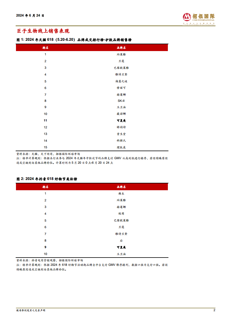 2024年“618”大促提前至5月开启现货售卖,巨子生物旗下品牌迅速抓住市场机遇。根据魔镜数据,可复美在1-5月累计GMV在天猫淘宝美容护肤品类中排名第16位,且在TOP30品牌中增速位列第一。其在天猫淘宝、京东和抖音的全平台1-5月GMV合计达到15.8亿元人民币,同比增长高达123%。其中,核心大单品胶原棒和新品焦点面霜的放量,带动可复美面部精华和乳液/面霜品类GMV分别同比增长289%和385%。可丽金品牌同样表现出色,1-5月全平台GMV合计2.1亿元人民币,同比增长132%。在“618”期间,可复美在天猫快消品牌销售榜和护肤品牌销售榜中分别位列第13和第11,国货品牌中排名第三;在抖音618好物节美妆榜中排名第9,国货品牌中同样位列第三。
