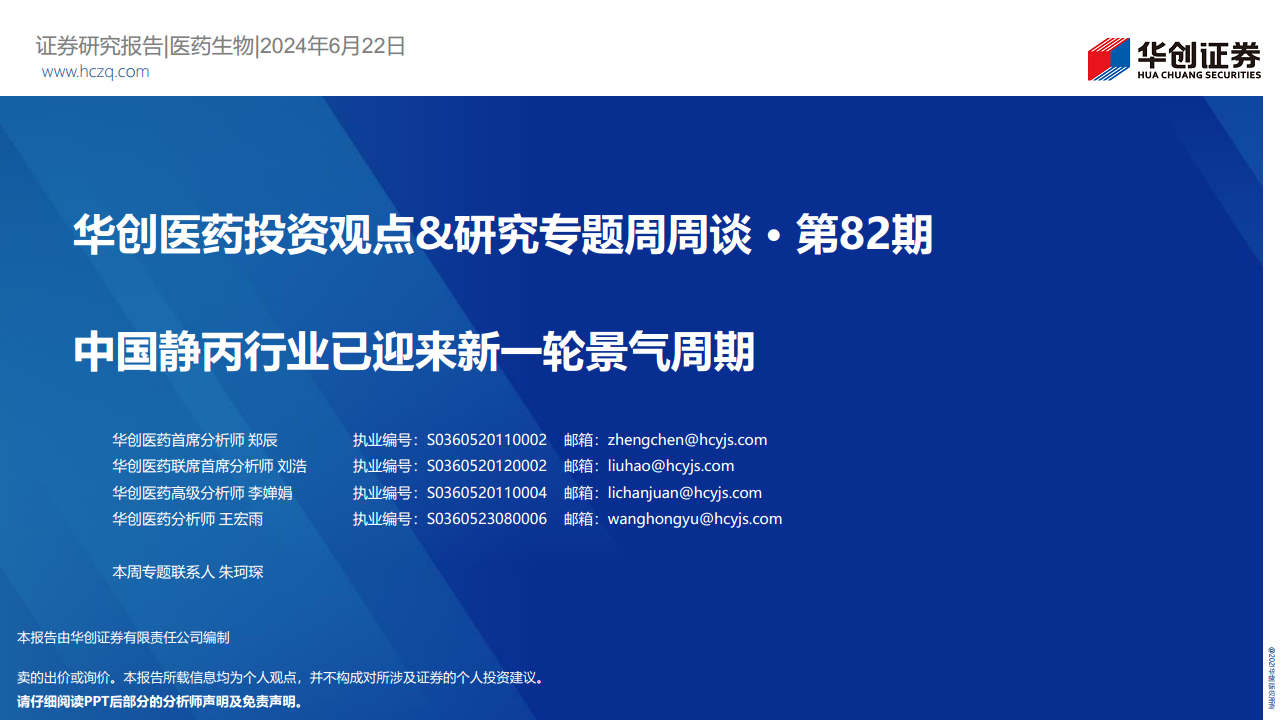 本报告核心观点认为,当前医药板块估值处于历史低位,公募基金配置不足,但随着宏观环境改善及大领域大品种的拉动,2024年医药行业有望迎来百花齐放的增长态势。特别指出,中国静丙行业已进入新一轮量价齐升的景气周期,成为行业增长的重要驱动力。