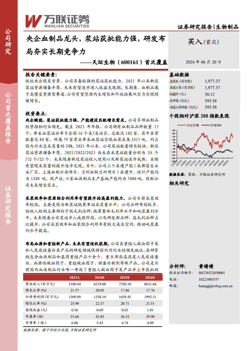 天坛生物(600161):首次覆盖:央企血制品龙头,浆站获批能力强,研发布局夯实长期竞争力