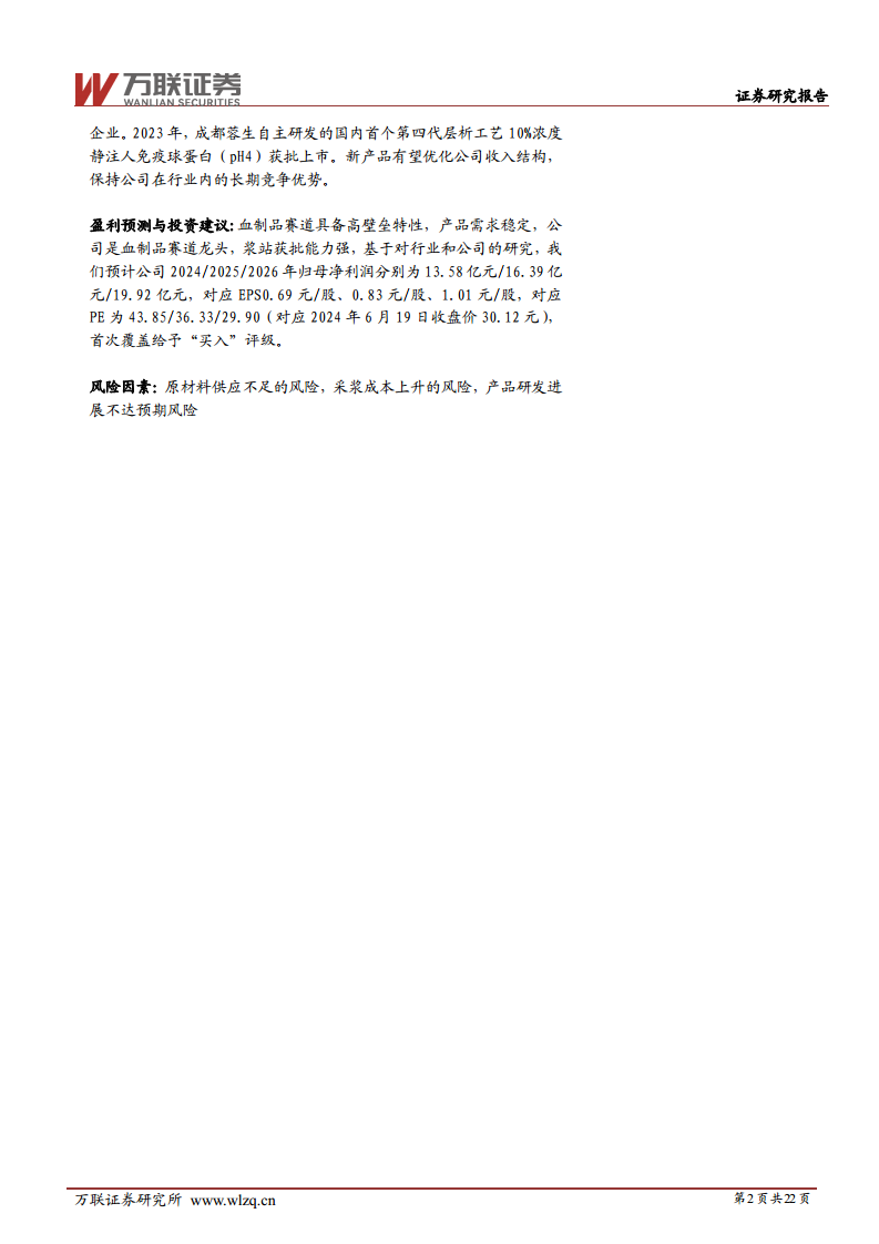从公司品种布局和收入结构来看,凝血因子类产品销售尚未充分发力。然而,随着公司凝血因子类产品占比的提升以及新产品的研发和上市,预计凝血因子类血制品收入将在较低基数上保持稳定增长,其毛利率也将参考同业高水平。