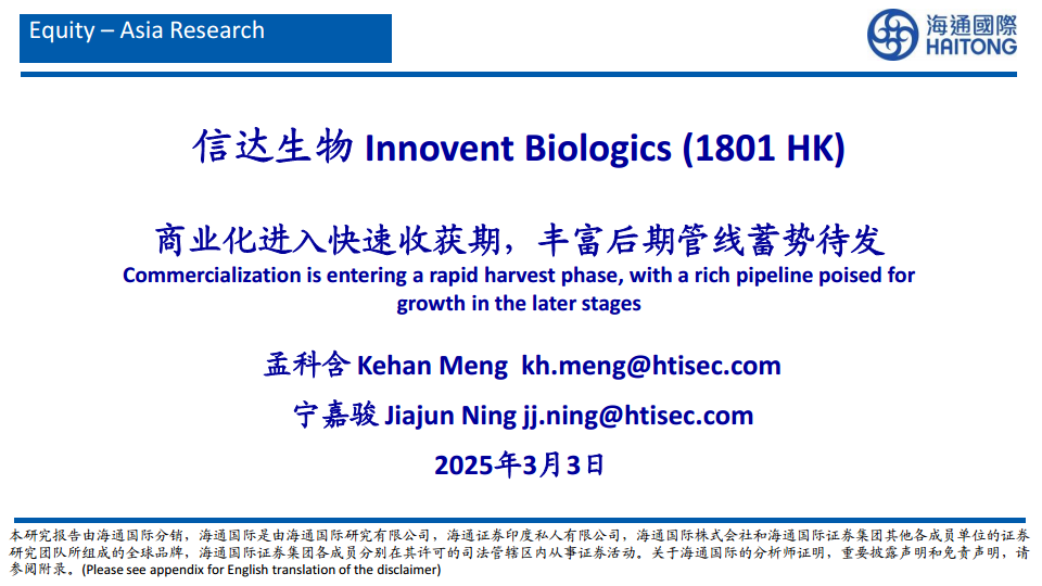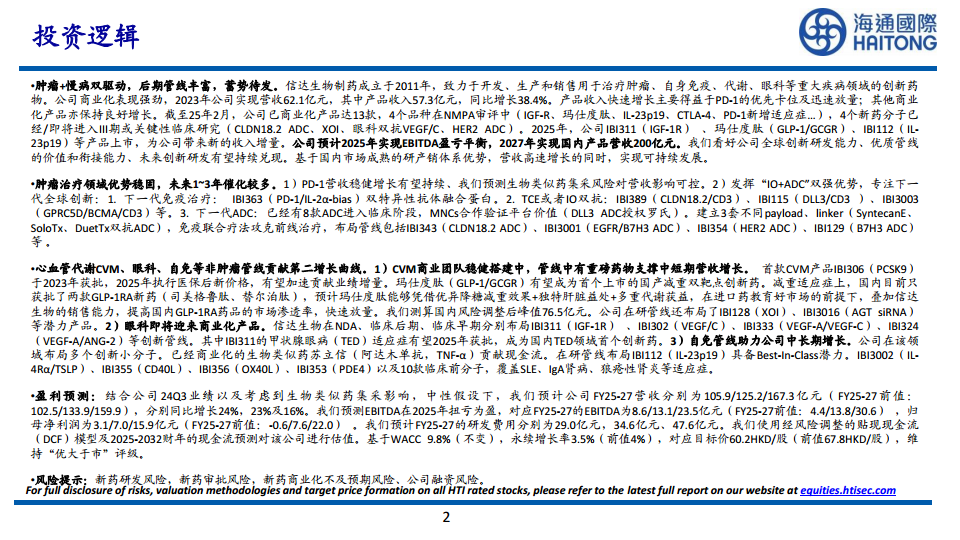 信达生物正处于商业化快速增长期,凭借其在肿瘤和慢病领域的“双轮驱动”战略,以及丰富且具有全球创新潜力的后期管线,展现出强大的市场竞争力。公司在2023年营收实现显著增长,并通过优化运营效率,预计在2025年实现EBITDA盈亏平衡,并有望在2027年达到200亿元的国内产品营收目标。尽管生物类似药集采带来一定挑战,但其影响预计可控,且玛仕度肽等重磅创新药的商业化潜力巨大。在肿瘤领域,公司通过“IO+ADC”双强优势持续巩固领先地位,多款创新药物如IBI343、IBI389、IBI363等进展迅速。在非肿瘤领域,心血管代谢、眼科和自免管线作为第二增长曲线,玛仕度肽、IBI306、IBI311和IBI112等产品有望带来显著业绩贡献。海通国际基于稳健的盈利预测和DCF估值模型,维持信达生物“优大于市”评级,反映了对其未来增长潜力和创新价值的积极展望。
