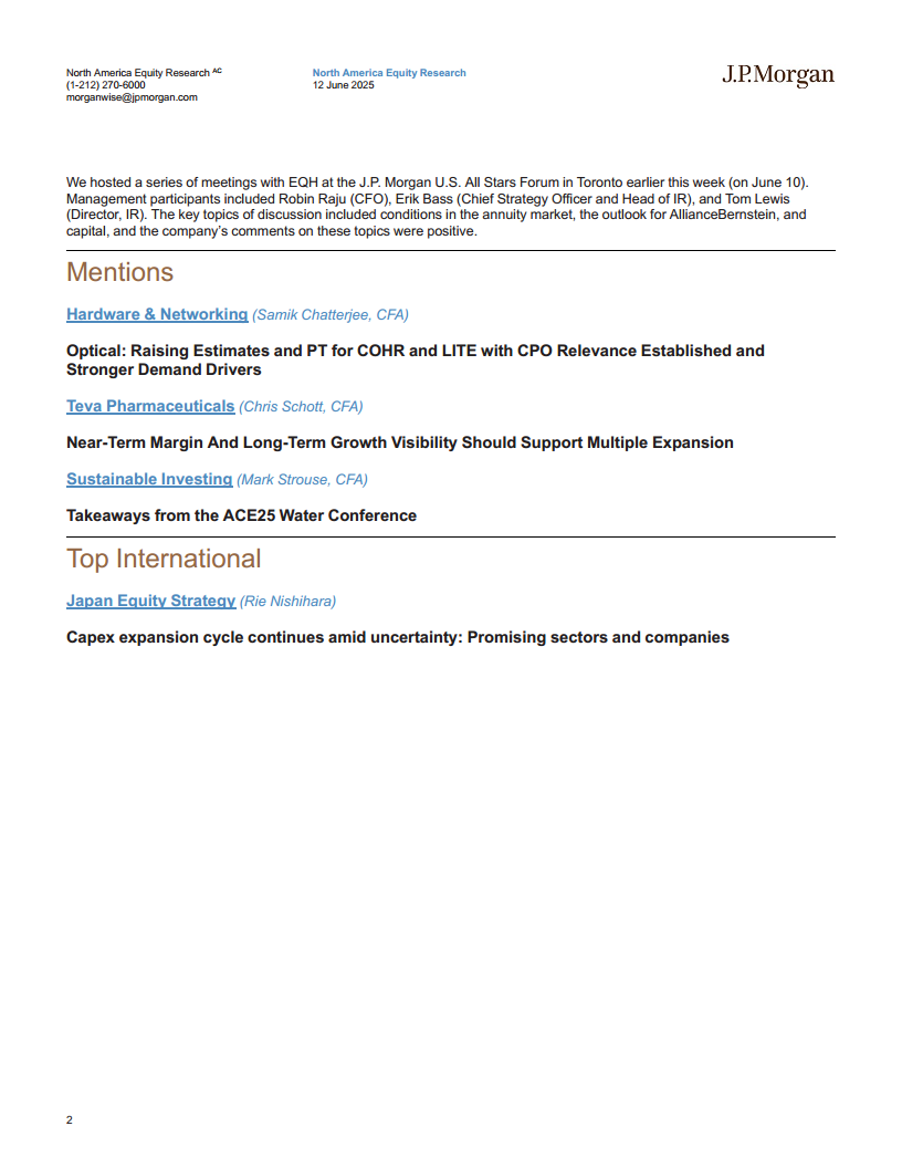 J.P. Morgan在5月22日至6月16日期间安排了密集的电话会议和研讨会,涵盖技术策略、安全软件、清洁能源、电力与公用事业、机械工程与建筑、垂直软件与互联网基础设施、餐饮与食品服务分销、巴西宏观与市场展望、通信基础设施、清洁氢能、北美钢铁市场、住宅建筑与建材、eVTOL市场、电气设备/多行业、SASE和SD-WAN、办公租赁/资本市场、核能、经纪商/资产管理公司与交易所、勘探与生产/油田服务、制药、公用事业与电力、财富招聘趋势、物流、黄金市场、航空货运与地面运输/航运、REITs与房地产服务、综合石油与炼油、美国政策、汽车零售生态系统、商业与信息服务、零售(百货商店与专业软线/休闲)、生命科学工具与诊断、半导体与半导体资本设备、电信服务/有线电视与卫星、软件(大中小型股)、北美金属与矿业CEO系列(锂、铝、循环材料、石墨、世纪铝业)、饮料/家庭与个人护理产品、美国中小型银行、专业与消费金融、零售(广义与硬线/休闲)、医疗用品与设备、互联网、人寿保险与财产险、数据中心浪潮以及公用事业总裁系列等多个领域。这些会议旨在为客户提供深入的市场分析和行业洞察。
