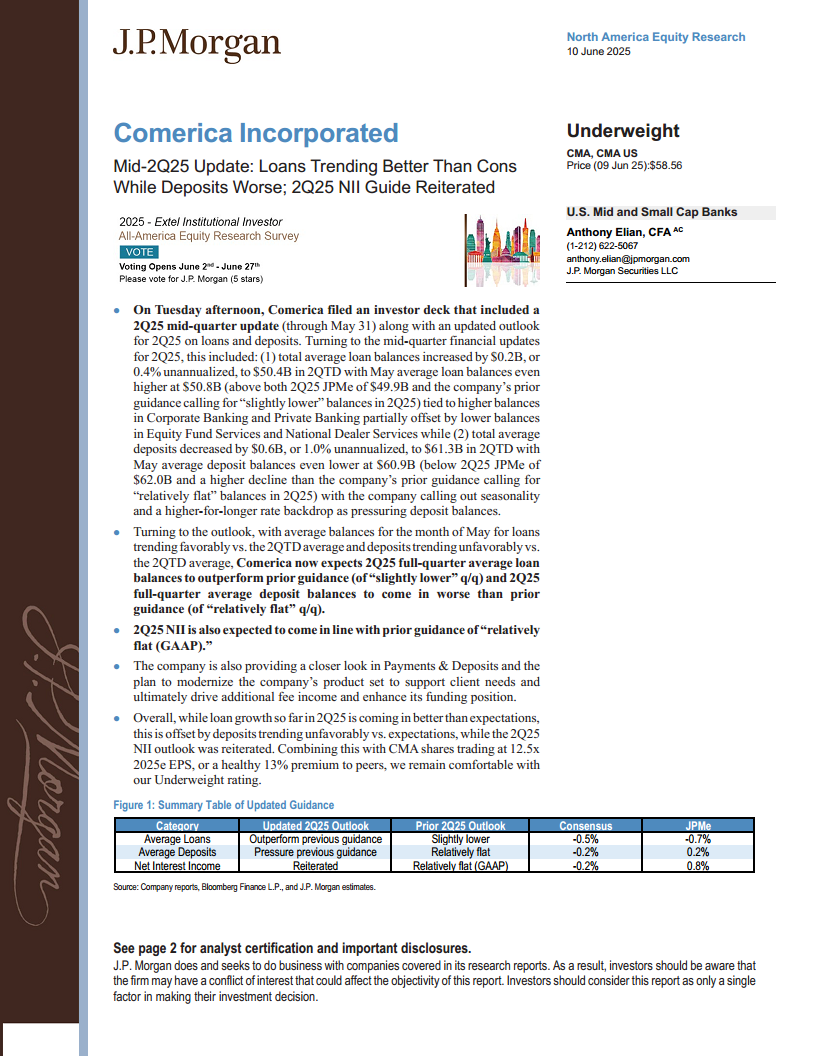 Comerica在2025年第二季度的中期更新显示,其贷款业务表现优于预期,但存款业务趋势不及预期,而净利息收入(NII)指引保持不变。鉴于这种混合的财务表现以及该股票相对于同业的估值溢价,摩根大通维持对Comerica的“减持”评级。