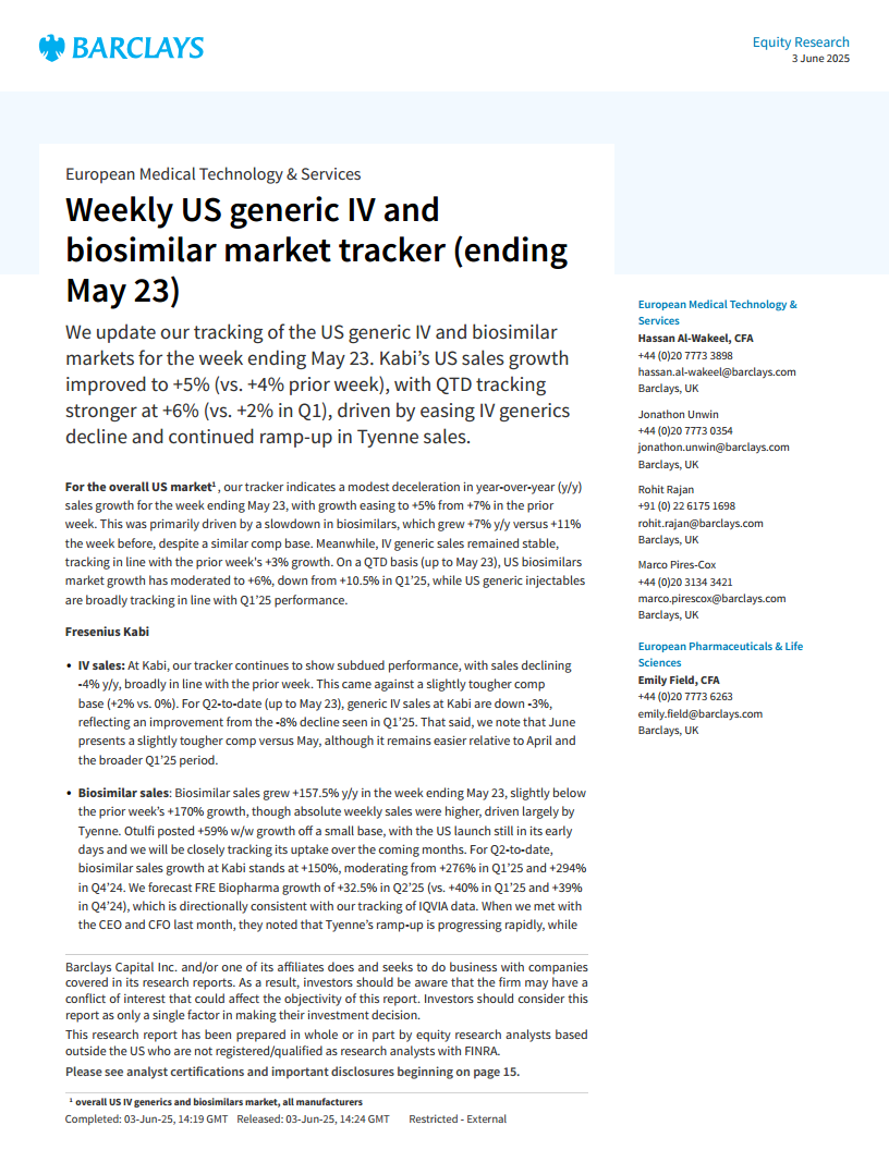 尽管卡比表现积极,但截至5月23日当周,美国整体仿制静脉注射和生物仿制药市场销售额同比增长略有放缓,主要受生物仿制药增速减缓影响,而静脉注射仿制药销售则保持稳定。这表明市场存在结构性变化,生物仿制药领域的竞争和增速调整正在发生。