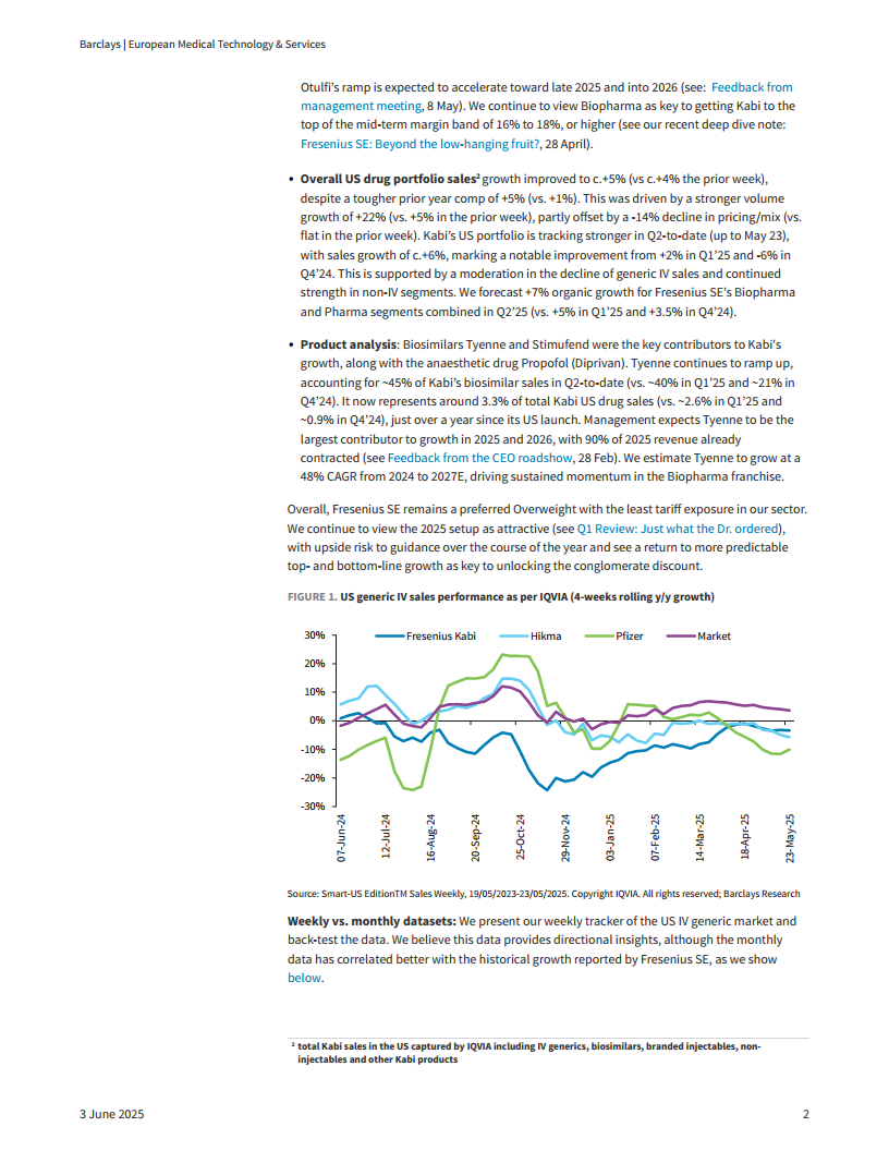 本报告核心观点指出,费森尤斯卡比(Fresenius Kabi)在美国市场的销售增长在2025年第二季度至今表现强劲,主要得益于静脉注射仿制药(IV generics)销售降幅的收窄以及生物仿制药(biosimilars)业务的快速增长,特别是Tyenne产品的显著贡献。生物仿制药业务被视为卡比实现中期利润率目标的关键。