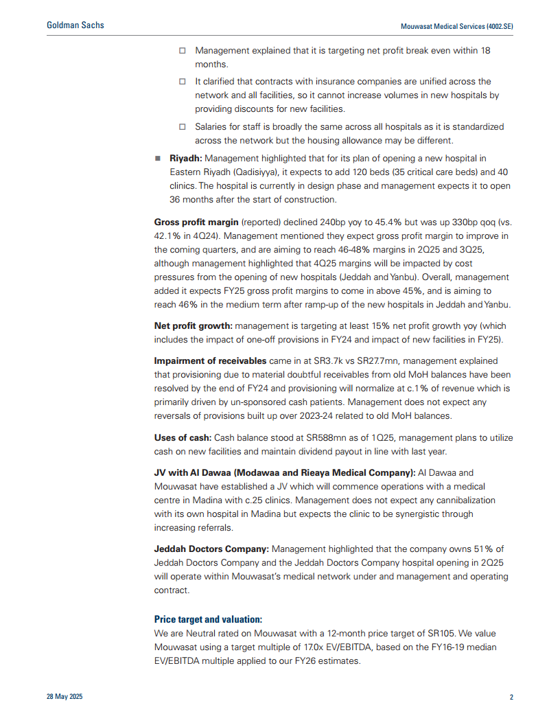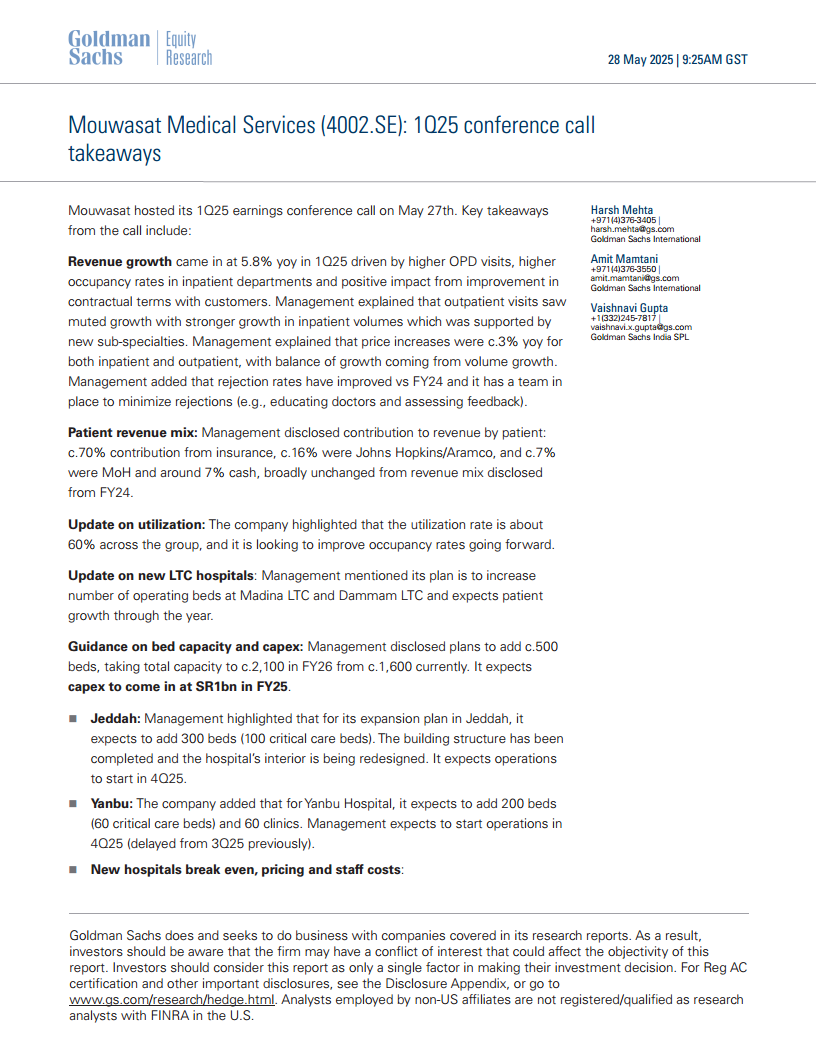 Mouwasat Medical Services在2025年第一季度表现出强劲的营收增长,得益于运营效率提升和合同条款优化。公司正积极实施大规模扩张计划,包括在吉达、延布和利雅得新建或扩建医院,预计将显著增加床位容量并提升市场覆盖。尽管新医院开业可能带来短期成本压力,但管理层对未来毛利率的改善和至少15%的净利润增长持乐观态度。通过解决历史应收账款问题、优化现金使用以及战略性地进行合资和股权投资,Mouwasat正为实现中长期增长和提升股东价值奠定坚实基础。高盛维持“中性”评级,并指出股息、收购、政府法规、定价能力和外籍人口增长是影响未来表现的关键风险因素。