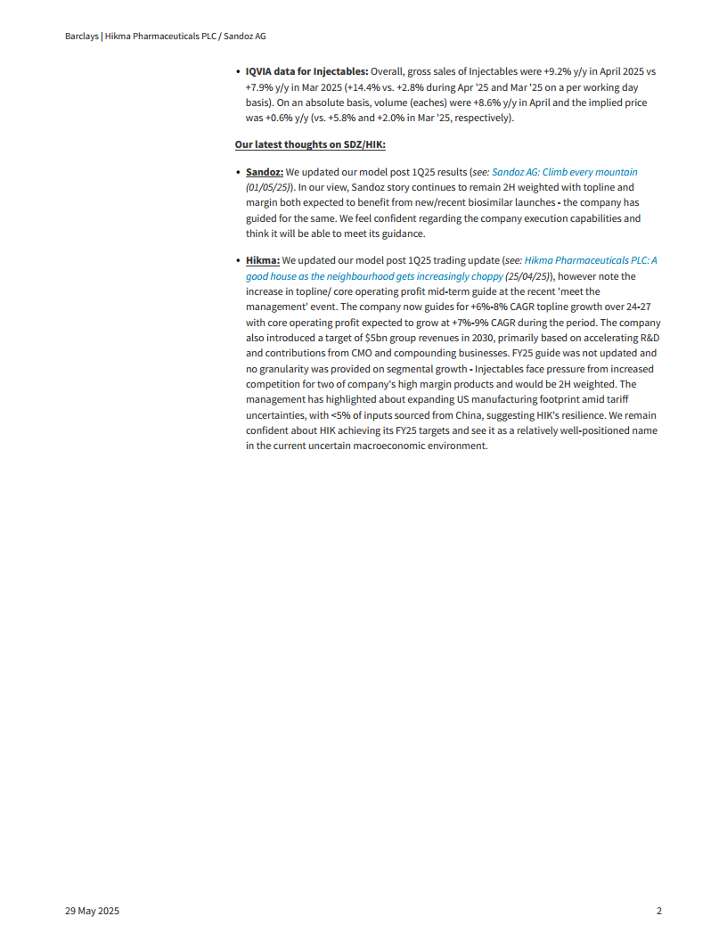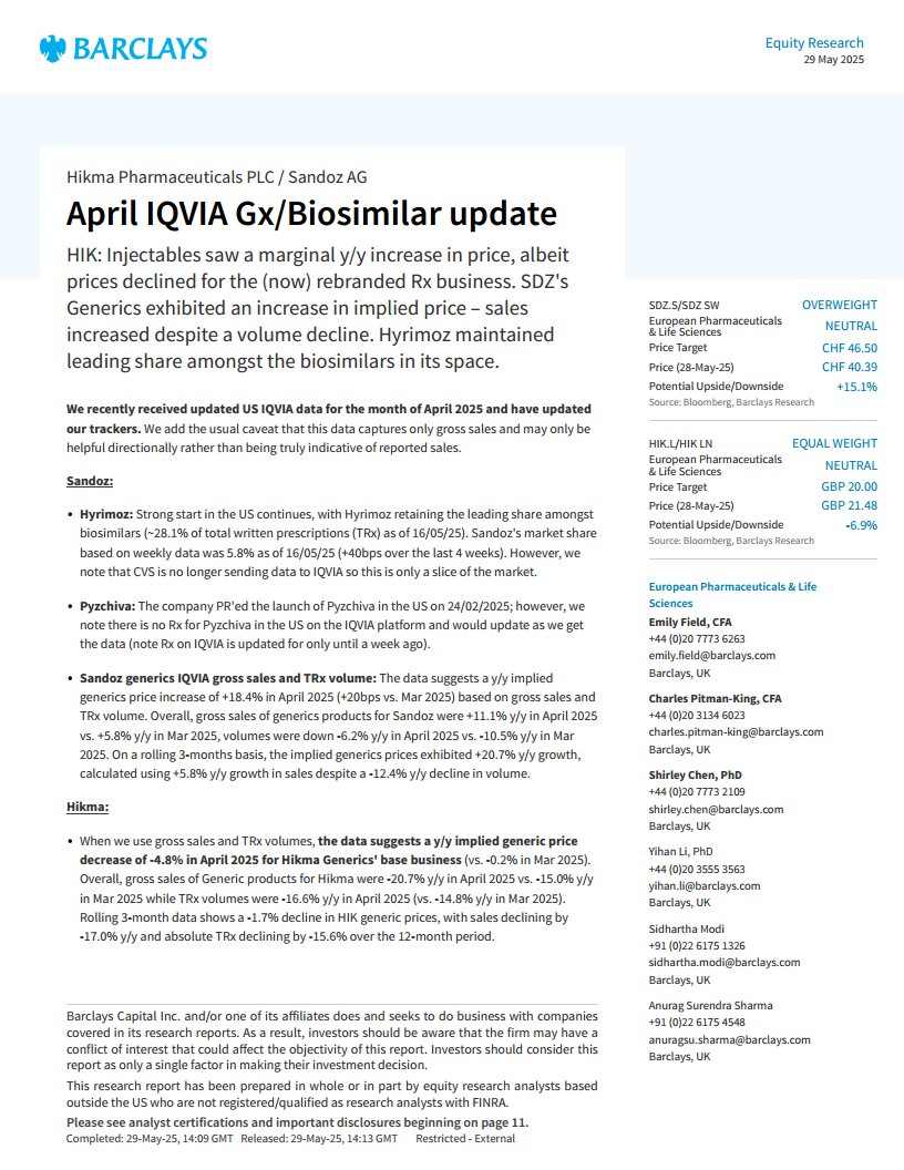本报告基于2025年4月的IQVIA数据,深入分析了Sandoz和Hikma在仿制药、生物类似药及注射剂市场的表现。
