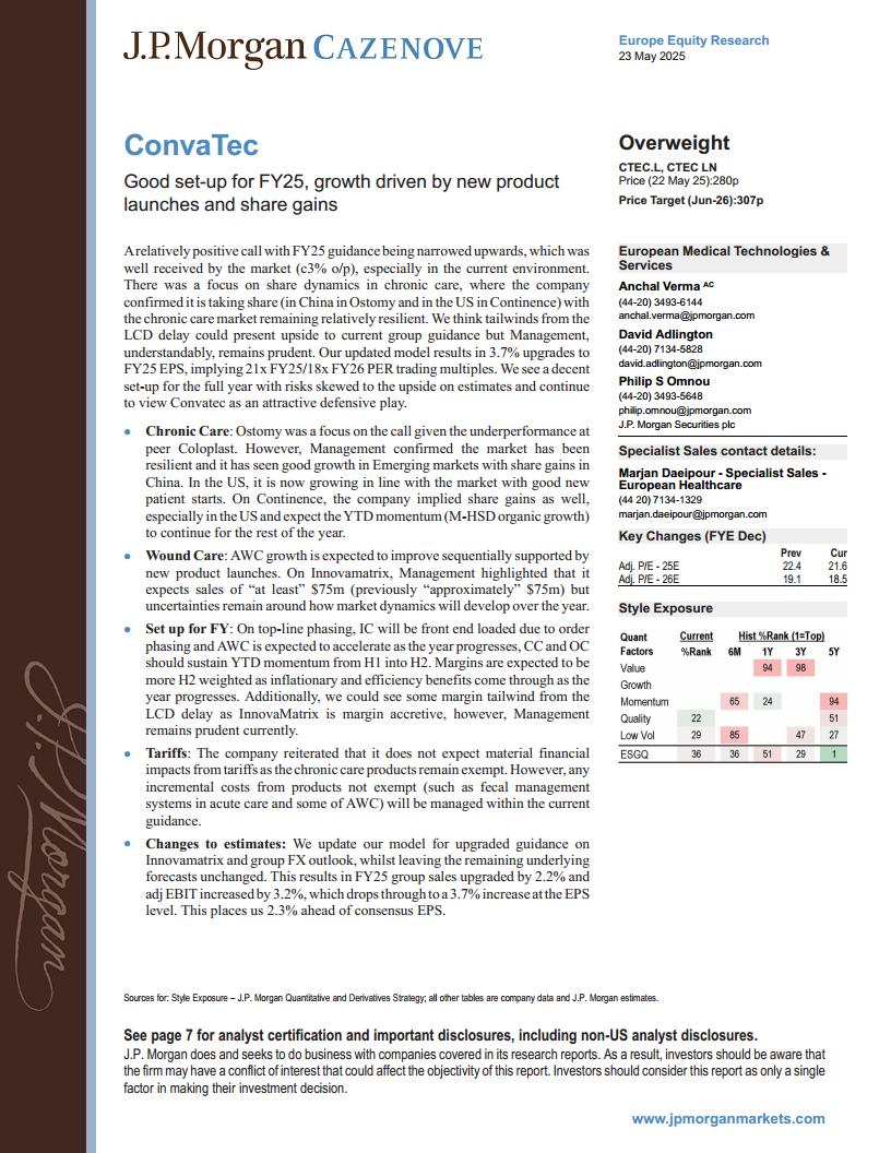 本报告对ConvaTec 的投资前景持积极态度,维持“增持”评级,并将目标价设定为307便士。公司在2025财年开局良好,得益于新产品发布和在慢性护理市场(尤其是在中国造口护理和美国失禁护理)的市场份额增长。管理层上调了FY25业绩指引,J.P. Morgan 也相应上调了FY25的销售额、EBIT和EPS预测,其中EPS上调3.7%。