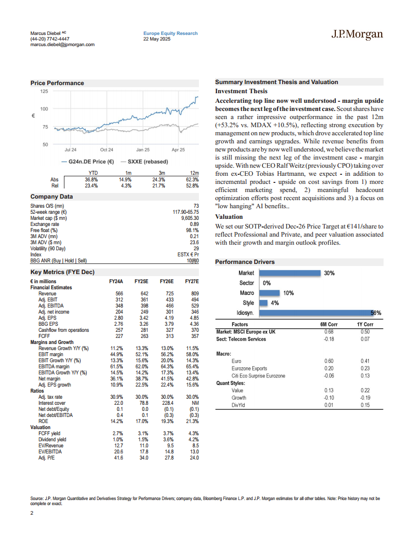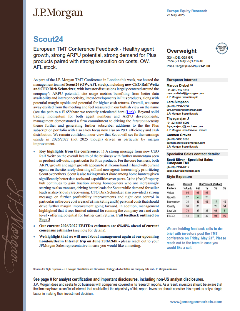 J.P. Morgan在2025年5月22日的报告中,对Scout24(G24n.DE, G24 GR)维持“增持”评级,并将其纳入分析师重点关注名单(AFL stock),目标价设定为2026年12月的141.00欧元,相较于2025年5月21日的116.40欧元股价,具有显著上涨空间。此次欧洲TMT大会上,Scout24管理层(包括新任CEO Ralf Weitz和CFO Dirk Schmelzer)与投资者进行了深入讨论,核心议题集中在公司的ARPU潜力、受益于更优数据可用性和互联互通的网站使用指标、Plus产品的最新进展、潜在的利润率上行空间以及更高的现金回报潜力。J.P. Morgan对会议结果感到振奋,并重申了对Scout24的看涨观点。报告指出,除了代理商数量和ARPU发展的稳健交易势头外,管理层还坚定致力于进一步推动“互联互通”主题,增加Plus订阅产品组合的用户数量,并重点关注损益效率和现金分配。J.P. Morgan坚信Scout24将在2026/2027年实现进一步的盈利增长,尤其受到利润率改善的驱动。