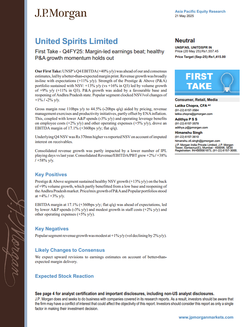 本报告分析了United Spirits Limited (UNSP) 2025财年第四季度的业绩表现、市场预期、投资论点、估值及相关风险。报告指出,UNSP本季度EBITDA同比增长40%,显著超出市场预期,主要得益于毛利率和EBITDA利润率的显著提升。高端及以上(P&A)产品组合表现出强劲的增长势头,而大众产品组合增长较为温和。J.P. Morgan预计市场将上调UNSP的盈利预测,并预计股价将出现积极反应。尽管公司在印度酒类市场具有长期结构性增长潜力,且在高端化和成本控制方面表现良好,但报告认为这些利好因素已在当前股价中得到充分反映。因此,J.P. Morgan维持对UNSP的“中性”评级,并设定2025年9月目标价为1,415卢比,等待更佳的投资入场时机。报告还详细列举了可能影响评级和目标价的上下行风险因素,包括市场需求、原材料成本和监管政策等。
