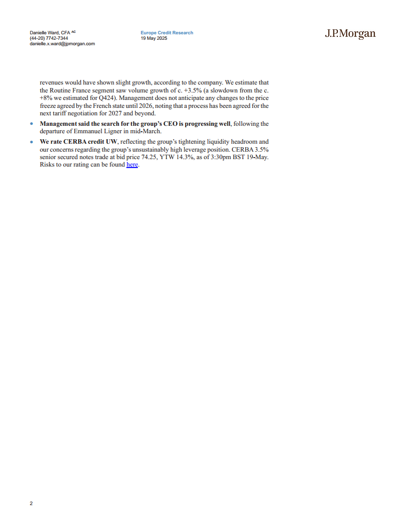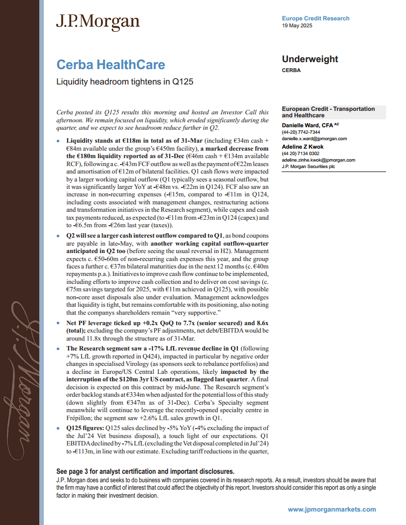 Cerba HealthCare在2025年第一季度面临严峻的财务挑战,其流动性状况显著恶化,总流动性大幅下降,且预计第二季度将继续收紧。公司自由现金流出扩大,营运资本压力增加,非经常性支出上升,同时杠杆率持续处于高位,调整后净杠杆率已达7.7倍(高级有担保)和8.6倍(总计)。在业务层面,研究部门表现不佳,同店收入大幅下滑,主要受订单变化和合同中断影响,而专业部门和法国常规业务的增长也出现放缓。尽管管理层正在积极采取措施改善现金流,包括成本节约和潜在的非核心资产处置,并强调股东支持,但J.P. Morgan基于对流动性收紧和高杠杆的担忧,维持对Cerba HealthCare信贷的“减持”评级。公司未来的财务表现和信用状况仍面临显著不确定性。