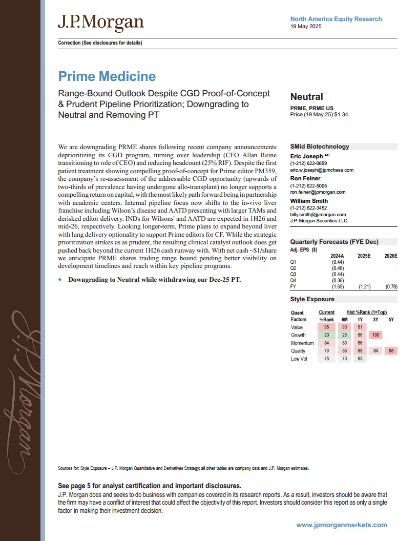 摩根大通对Prime Medicine的评级下调至“中性”并撤销目标价,主要反映了公司在战略方向上的重大调整及其对近期财务和市场表现的影响。尽管Prime编辑技术在CGD治疗中展现出概念验证,但公司基于市场潜力重新评估后,决定将重心转向具有更大潜在市场和更低风险的体内肝脏疾病管线(如威尔逊病和AATD)。这一战略转变虽然被认为是审慎的,但导致临床催化剂的出现时间被推迟,超出了公司目前的现金流支持期限。