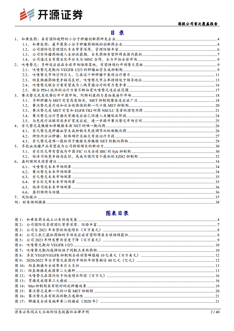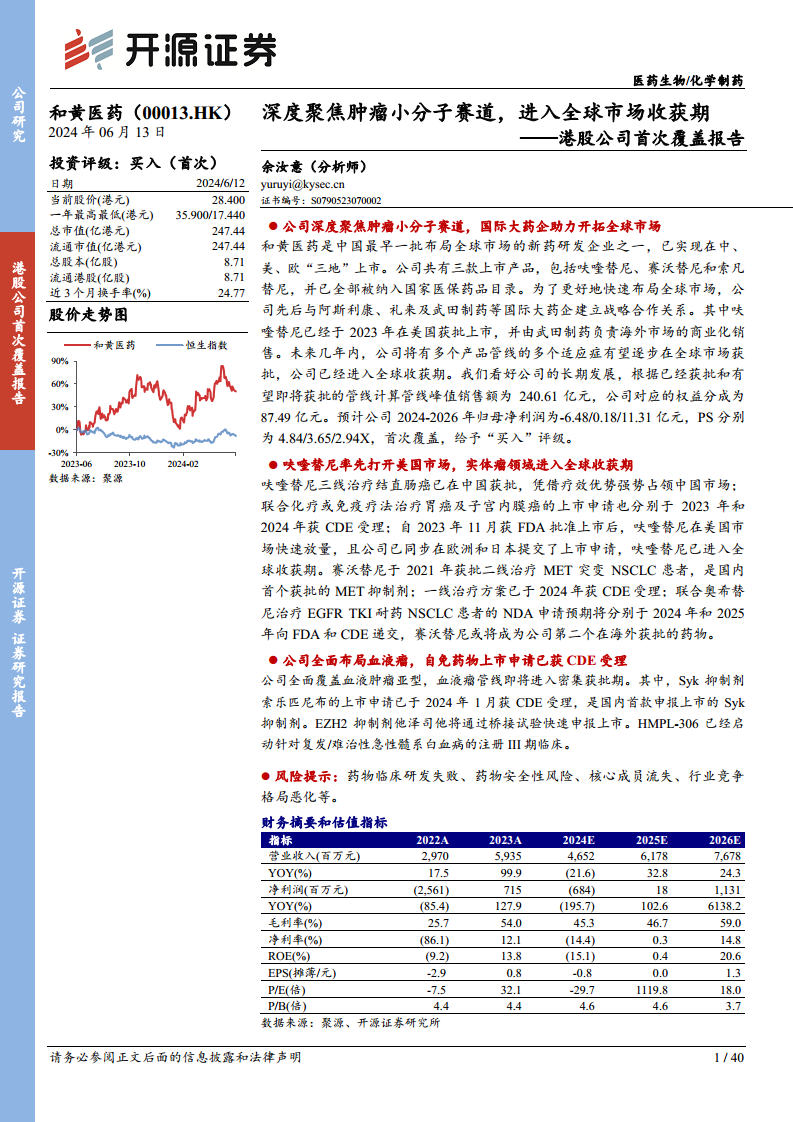 公司拥有三款已上市产品——呋喹替尼、赛沃替尼和索凡替尼,均已纳入国家医保药品目录,并在各自领域展现出强大的市场竞争力。呋喹替尼在结直肠癌领域已占据中国市场领导地位,并在美国市场快速放量,其联合疗法在胃癌和子宫内膜癌等新适应症的上市申请也已获受理。赛沃替尼作为中国首个获批的MET抑制剂,在非小细胞肺癌领域具有先发优势,并积极拓展胃癌和肾癌适应症。此外,索乐匹尼布和他泽司他等血液瘤及自免领域的新产品也即将进入密集获批期,有望成为公司持续增长的新动力。根据对已获批和即将获批管线的测算,公司管线峰值销售额预计达240.61亿元,对应的权益分成为87.49亿元。基于此,报告首次覆盖并给予“买入”评级,预计公司2024-2026年归母净利润将实现从亏损到盈利的转变,分别为-6.48亿元、0.18亿元和11.31亿元。