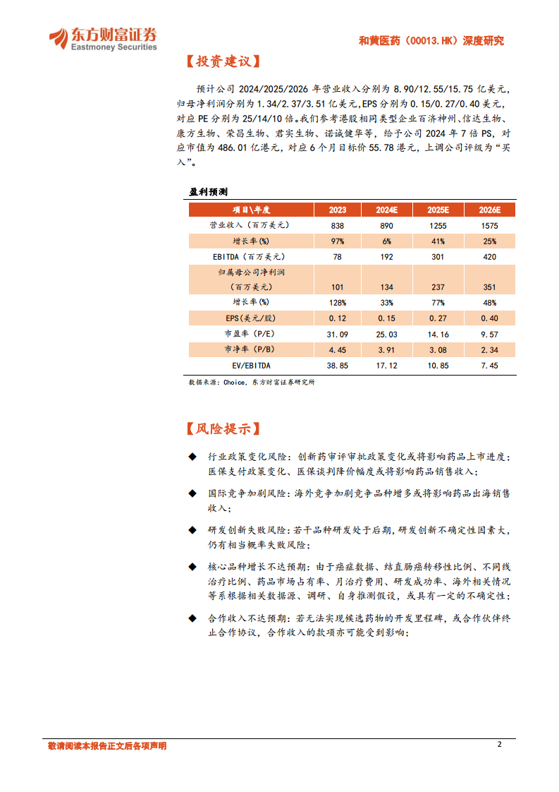 投资建议方面,参考港股同类型企业(如百济神州、信达生物等),给予公司2024年7倍PS,对应市值为486.01亿港元,对应6个月目标价55.78港元,上调公司评级为“买入”。