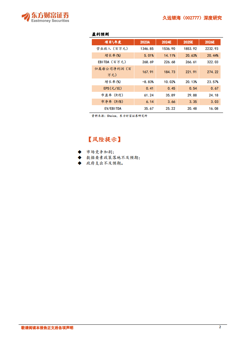 东方财富证券研究所调整盈利预测,预计公司2024-2026年营业收入分别为15.37/18.54/22.33亿元,归母净利润分别为1.85/2.22/2.74亿元,EPS分别为0.45/0.54/0.67元/股。参考数据要素可比公司估值,并考虑到经济形势好转、行业景气度修复以及公司在数据要素方面的深入布局和龙头地位,给予公司2025年33倍PE,对应12个月内目标价为17.9元,维持“买入”评级。