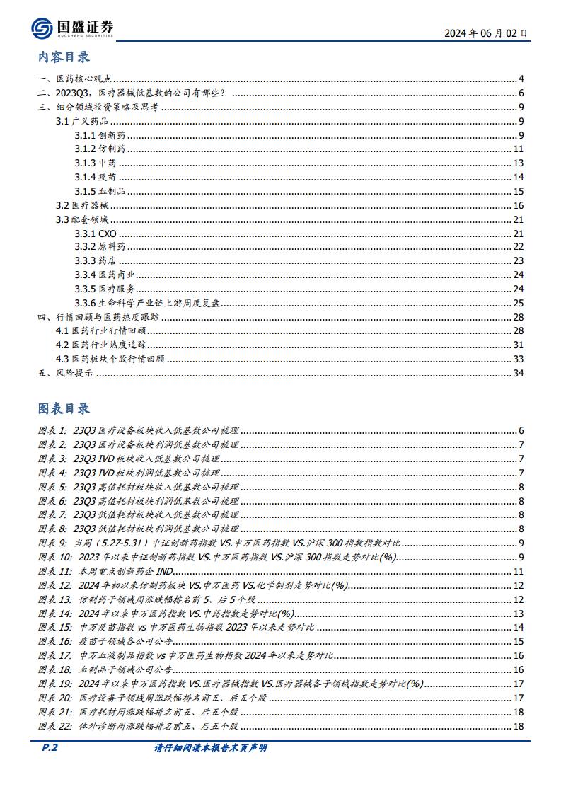 当周(5月27日至5月31日),申万医药指数环比下跌0.94%,在全行业中排名第17位,跑输创业板指数和沪深300指数。市场表现为缩量震荡微调,医药板块持续缩量调整,幅度边际减小,接近前期低点,呈现二次探底结构。板块关注度低,缺乏主线逻辑,个股表现以散点逻辑为主。展望未来,报告看好医药Q3交易氛围好转,判断逻辑基于Q3同比增速向好、创新系列政策支持及筹码出清。短期节奏上,建议关注Q2业绩,并提前布局Q3院端同比数据改善。Q3投资节奏上,先关注风格(国企改革、低位低估底部变化),后关注科技(快速商业化、大药企国际化、关键临床进展),同时寻求三线景气细分。