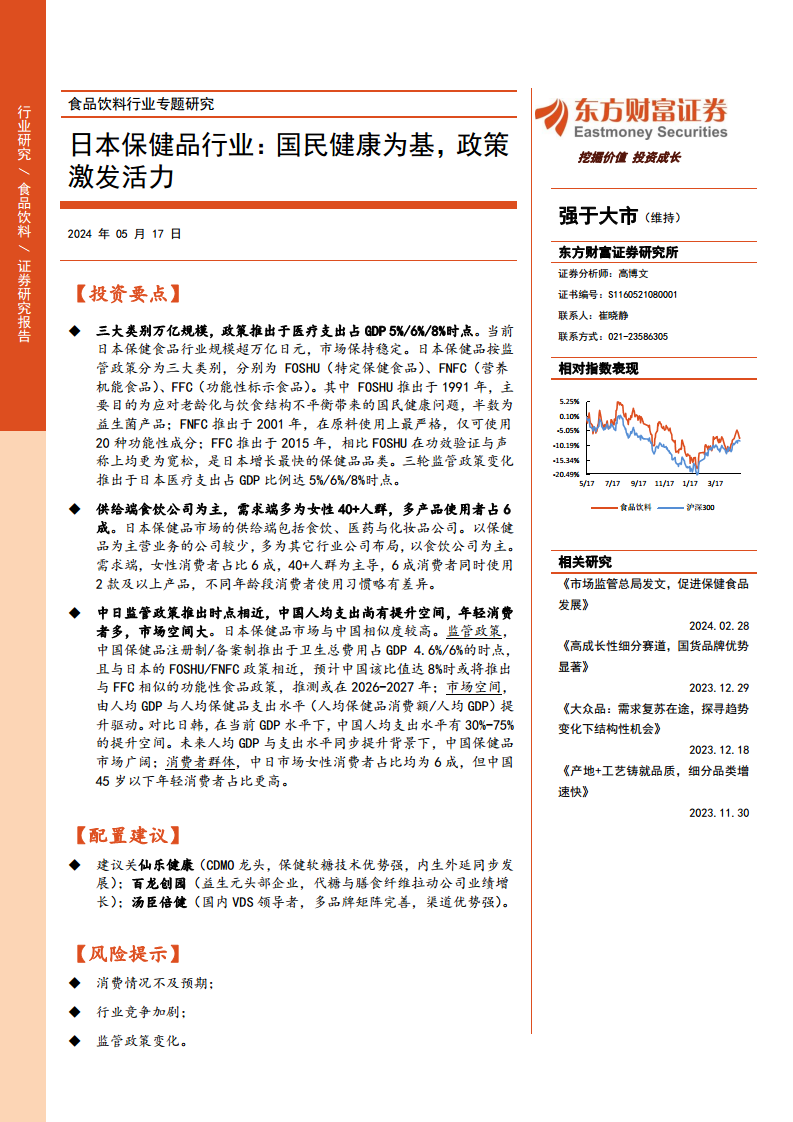 - 政策推出时点与未来展望:中国保健品行业两次重大监管政策变化(注册制/备案制)的推出时点,分别对应中国卫生总费用占GDP比例达4.6%/6%,这与日本FOSHU/FNFC/FFC推出时5%/6%/8%的节点相近。鉴于中国注册制/备案制分别类比或部分类比日本的FOSHU/FNFC,报告推测当中国卫生总费用占GDP比例达到或接近8%时(预计在2026-2027年),中国或将出台类似FFC的功能性食品相关政策。届时,食品饮料、医药、化妆品相关公司有望受益。