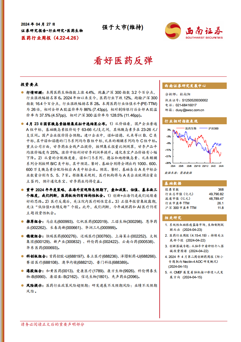 本周(4.22-4.26)医药生物指数表现强劲,上涨4.4%,跑赢沪深300指数3.2个百分点,在行业涨跌幅中排名第6。尽管年初至今医药行业整体仍下跌12%,跑输沪深300指数16.4个百分点,但近期反弹趋势明显。当前医药行业估值水平(PE-TTM)为26倍,相对全部A股溢价率为86%,显示出一定的估值修复空间。