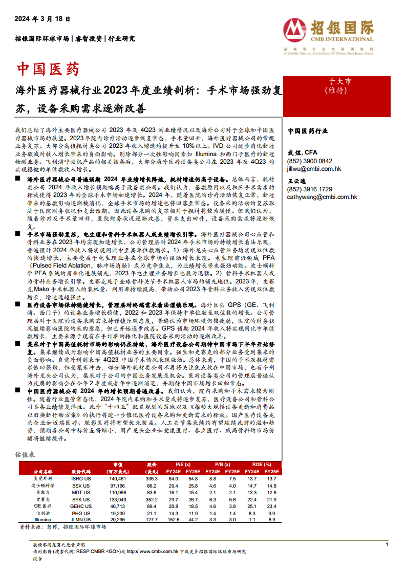 本报告详细梳理了直觉外科、爱德华生命科学、Illumina、波士顿科学、雅培、史赛克、捷迈邦美、强生(器械板块)、GE医疗、飞利浦、西门子医疗、美敦力等主要海外医疗器械公司2023年第四季度(或其对应财年季度)的业绩概况及电话会要点。
