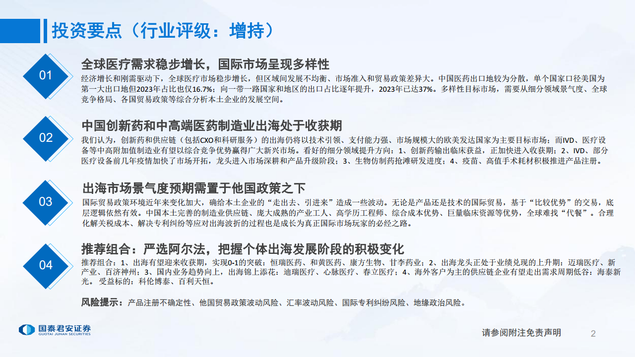 中国创新药和供应链(包括CXO和科研服务)的出海主要瞄准技术引领、支付能力强、市场规模大的欧美发达国家。同时,IVD、医疗设备等中高附加值制造业有望凭借综合竞争优势赢得广大新兴市场。报告看好创新药临床获益加速、IVD及部分医疗设备市场深耕、生物仿制药研发抢滩以及疫苗、高值手术耗材产品注册的积极进展。尽管国际贸易政策环境变化带来波动,但中国完善的制造业供应链、庞大成熟的产业工人、高学历工程师、综合成本优势及巨量临床资源等核心优势在全球范围内难以替代,是本土企业应对出海波折、成长为国际市场玩家的坚实基础。