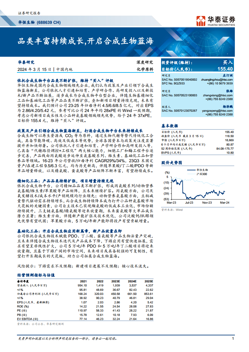 报告强调,政策和产业的共同引领正推动合成生物产业进入快速发展期,其在节能降碳、高效低成本及特殊化合物合成方面的优势日益凸显。华恒生物前瞻性地布局了PDO、丁二酸和蛋氨酸等具有百万吨级市场潜力的大单品,这些新产品的落地将显著打开公司的长期成长天花板。预计2023-2025年公司归母净利润将分别达到4.5亿元、6.6亿元和8.5亿元,对应EPS为2.86元、4.20元和5.42元。基于公司新项目的成长性和在小品种氨基酸领域的领先优势,报告维持“买入”评级,并给予2024年37倍PE,目标价155.4元。