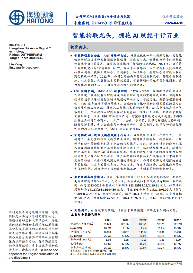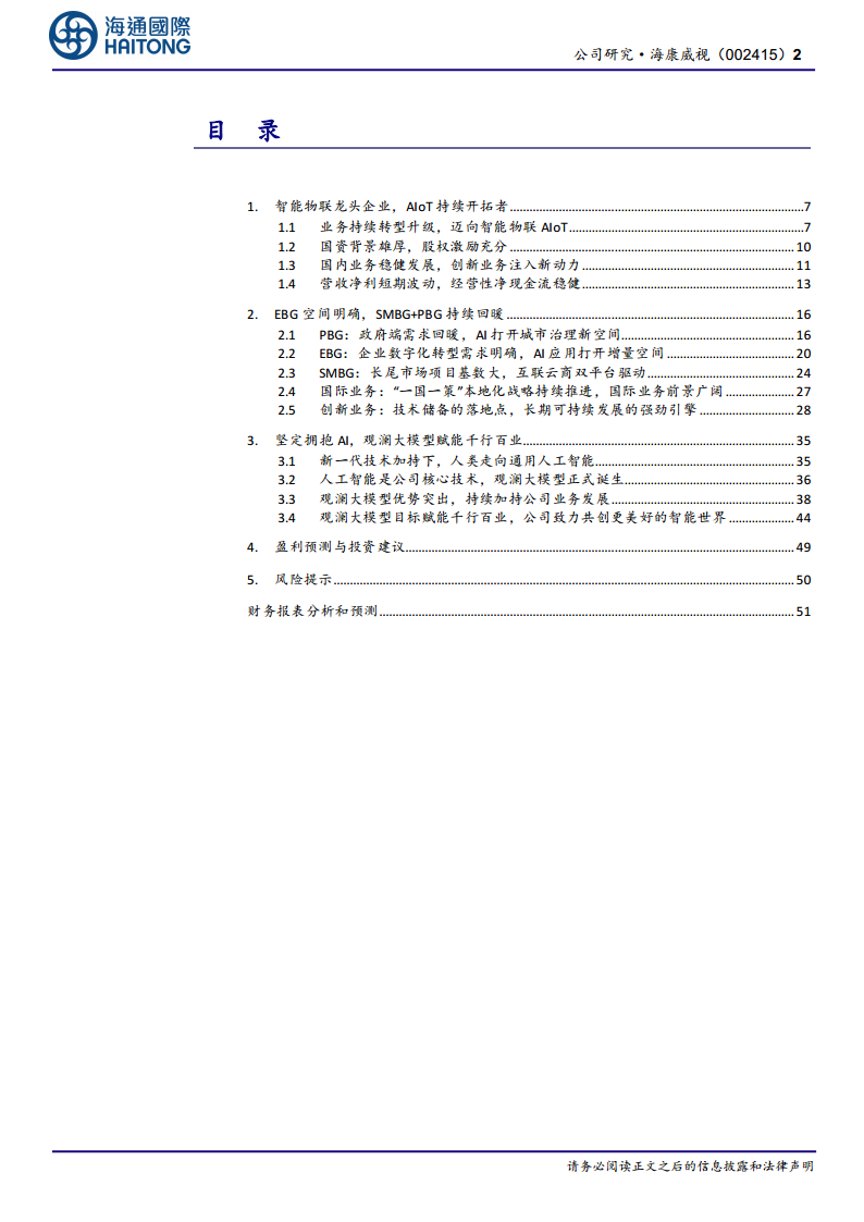 报告分析指出,海康威视在企业事业群(EBG)市场拥有明确的增长空间,同时公共服务事业群(PBG)和中小企业事业群(SMBG)业务也呈现持续回暖态势。随着“十四五”期间数字政府建设的加速、智慧城市规模的扩大以及企业数字化转型的深入,AI技术在各行业应用场景不断拓展,为公司带来了广阔的市场机遇。特别是海康威视自主研发的“观澜大模型”技术体系,已深度融合到产品创新和实际应用中,显著提升了智能产品性能并加速了AI在千行百业的落地部署,展现出强大的赋能潜力。